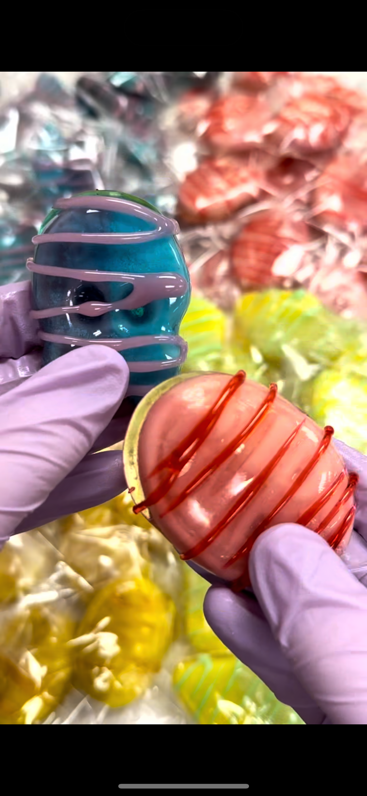 - Bubble Dizzy Skull with blue raspberry candy coating and a raspberry drizzle