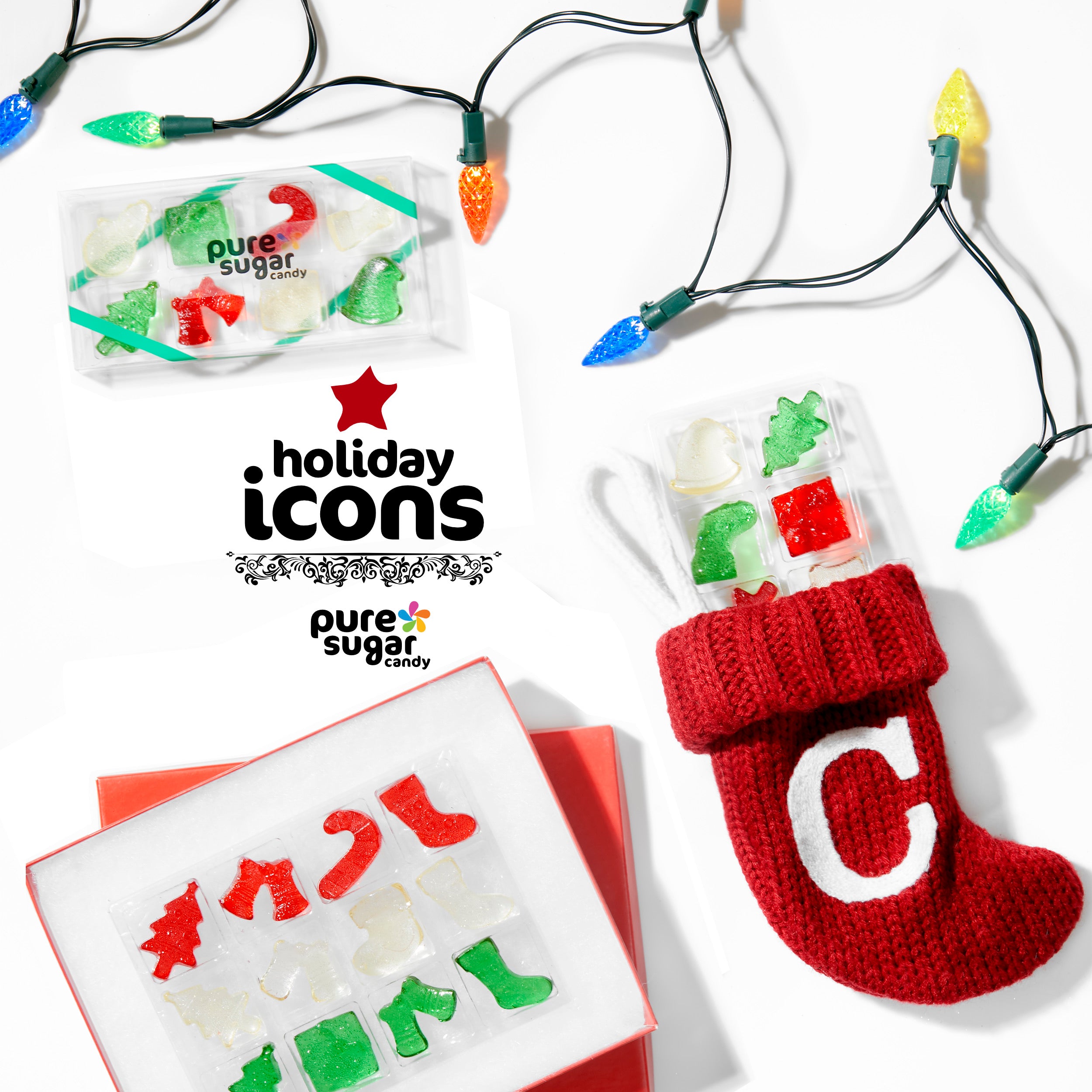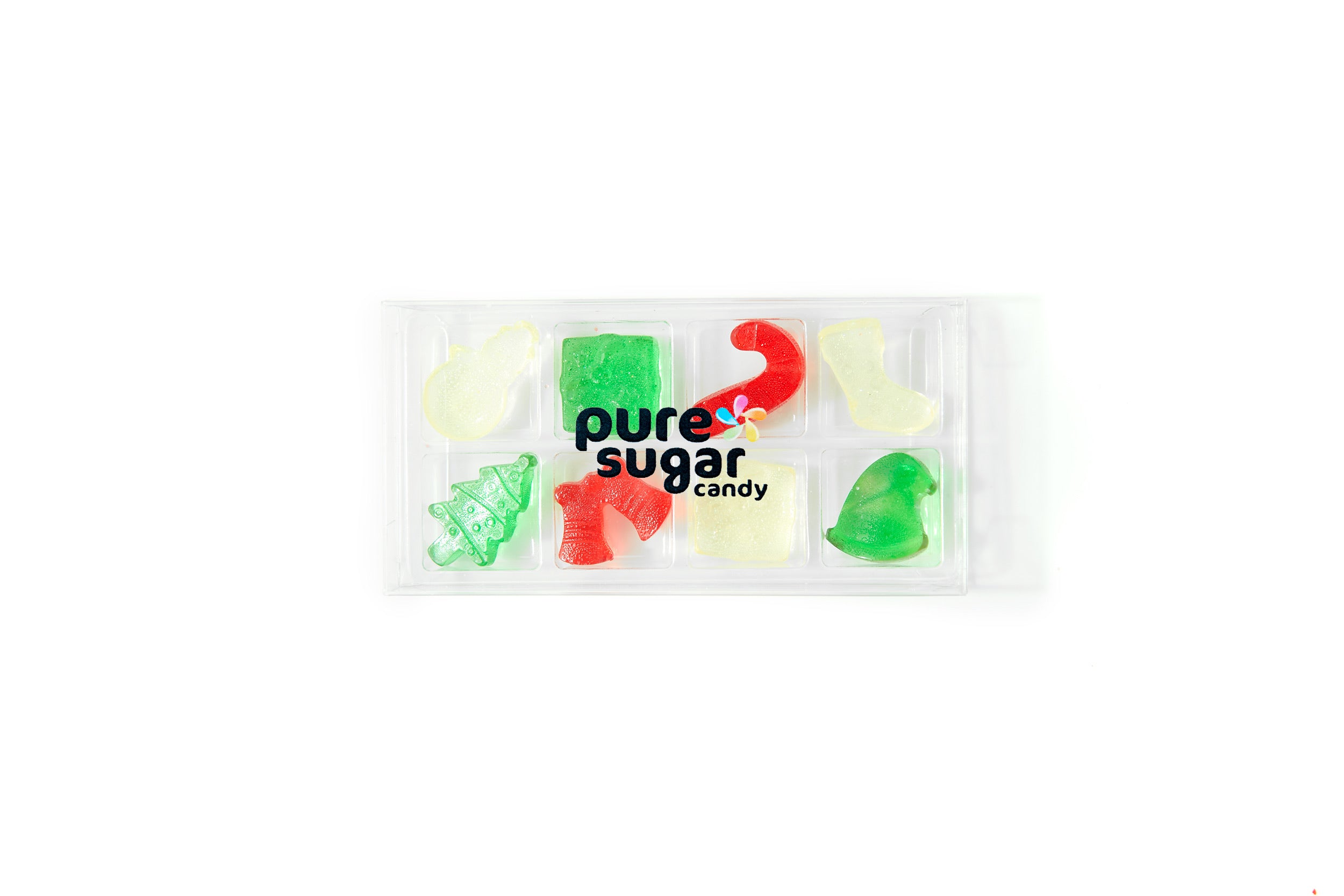 The perfect combination of the symbols we love for the HOLIDAY season! In an 8 pack tray you’ll have a Snowmen, a set of Christmas Bells, a Santa Hat, a Trees, a Gift Box, a Candy Cane, and a Stocking! They are Cake Batter, Cherry, and Green Apple flavor. Each candy is approximately 1” and the box of 8 is
