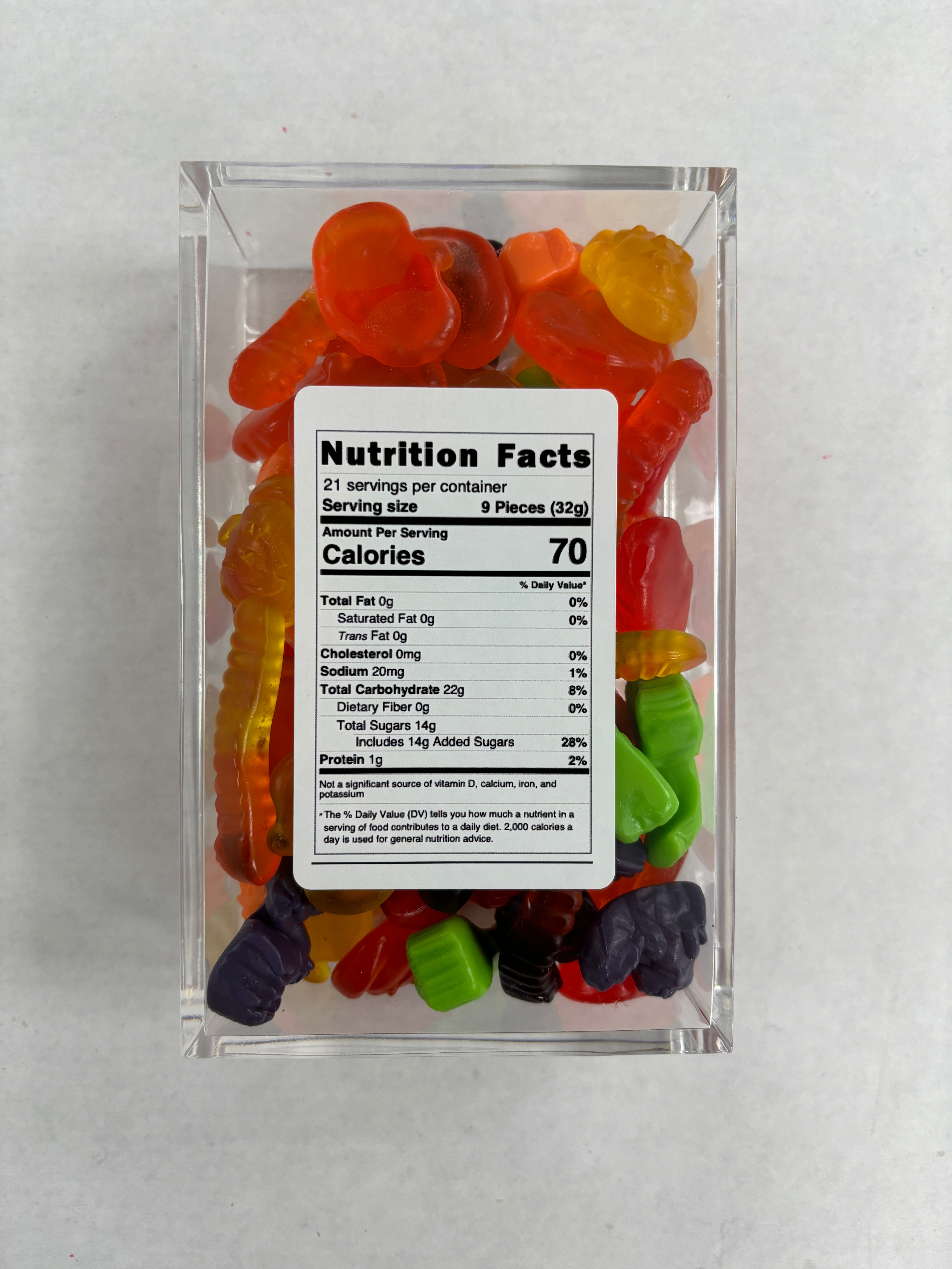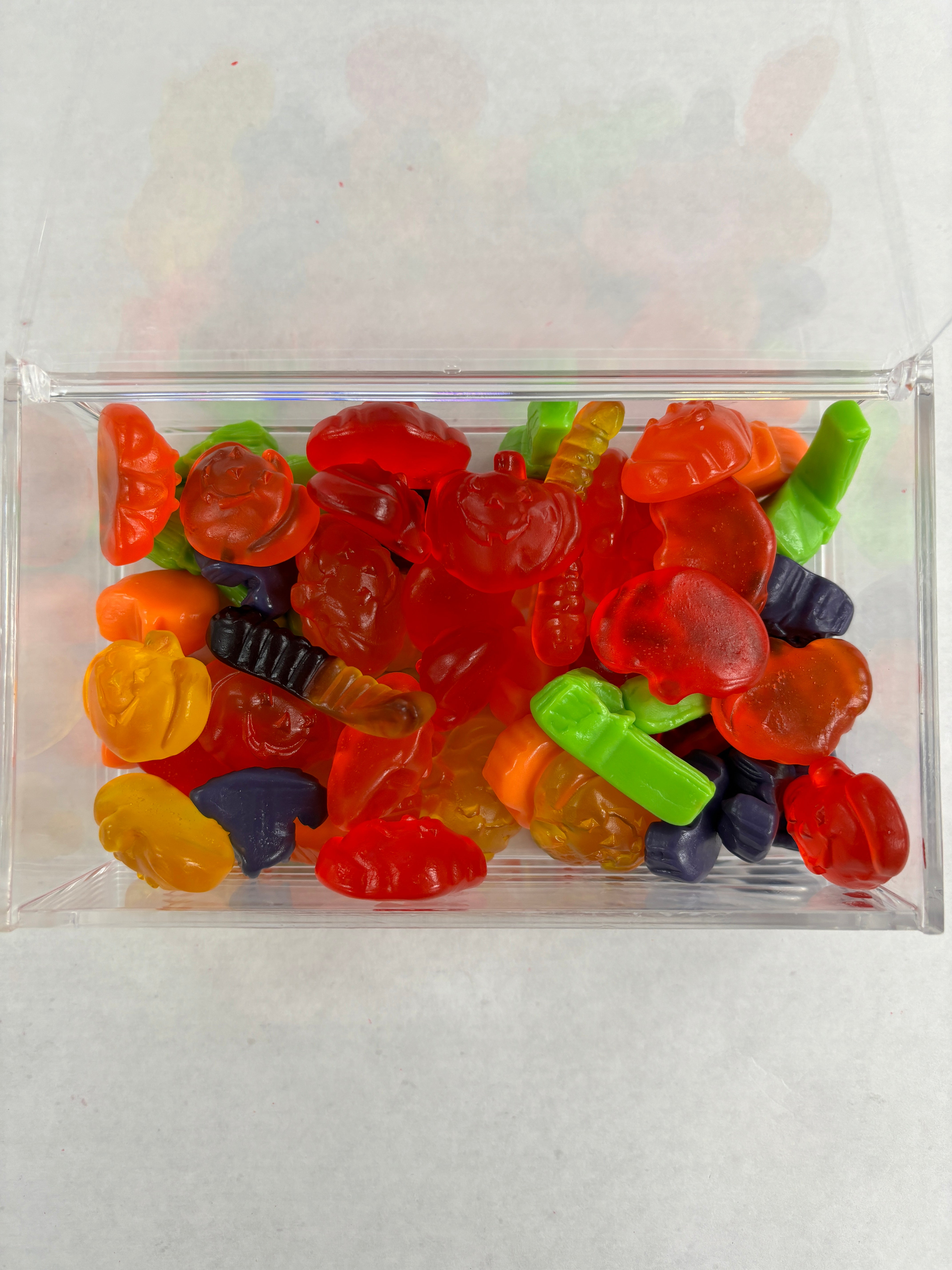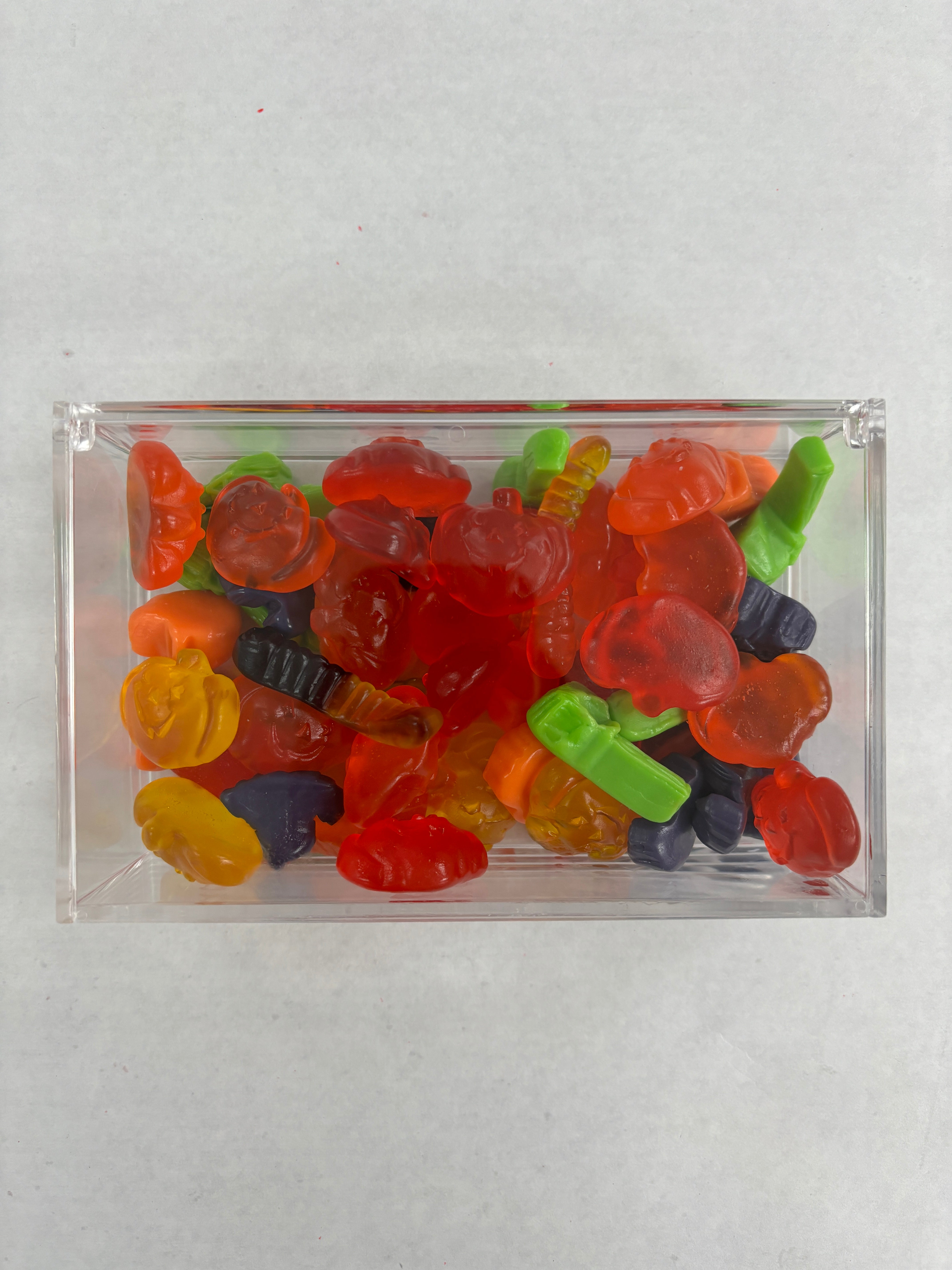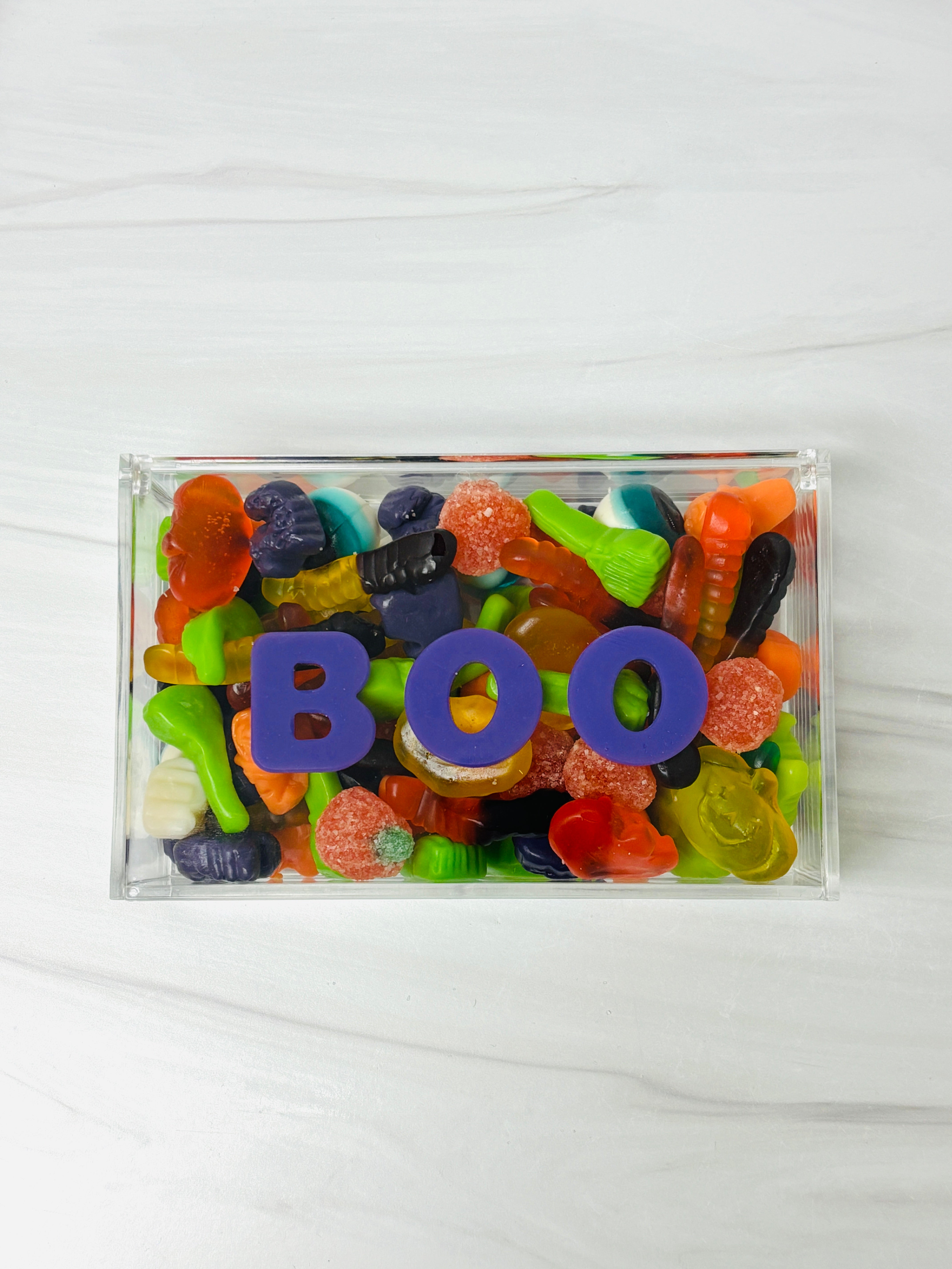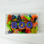 Happy (almost) Halloween! This yummy Halloween-themed gift box pairs hard candy watermelon letters with colorful gummy worms, pumpkins, jack-o'-lanterns, cats and brooms in fun fruit flavors. The reusable hinged box is made of durable Lucite. This is a must-have for the holiday!